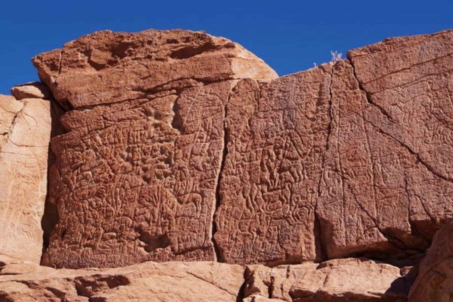 Vi begynder vores tur med at samle deltagerne op i centrum af byen for at køre vest for San Pedro de Atacama. Vores første stop bliver ved Yerbas Buenas, et område af stor historisk betydning, som huser en af de mest enestående helleristninger i regionen. Dette sted blev passeret af indfødte karavaner fra det nordøstlige Argentina og den bolivianske Altiplano på deres vej til Stillehavet. Her vil vi beundre en række helleristninger og tegninger, der bl.a. forestiller lamaer, kameldyr, fugle, aber og hunde.