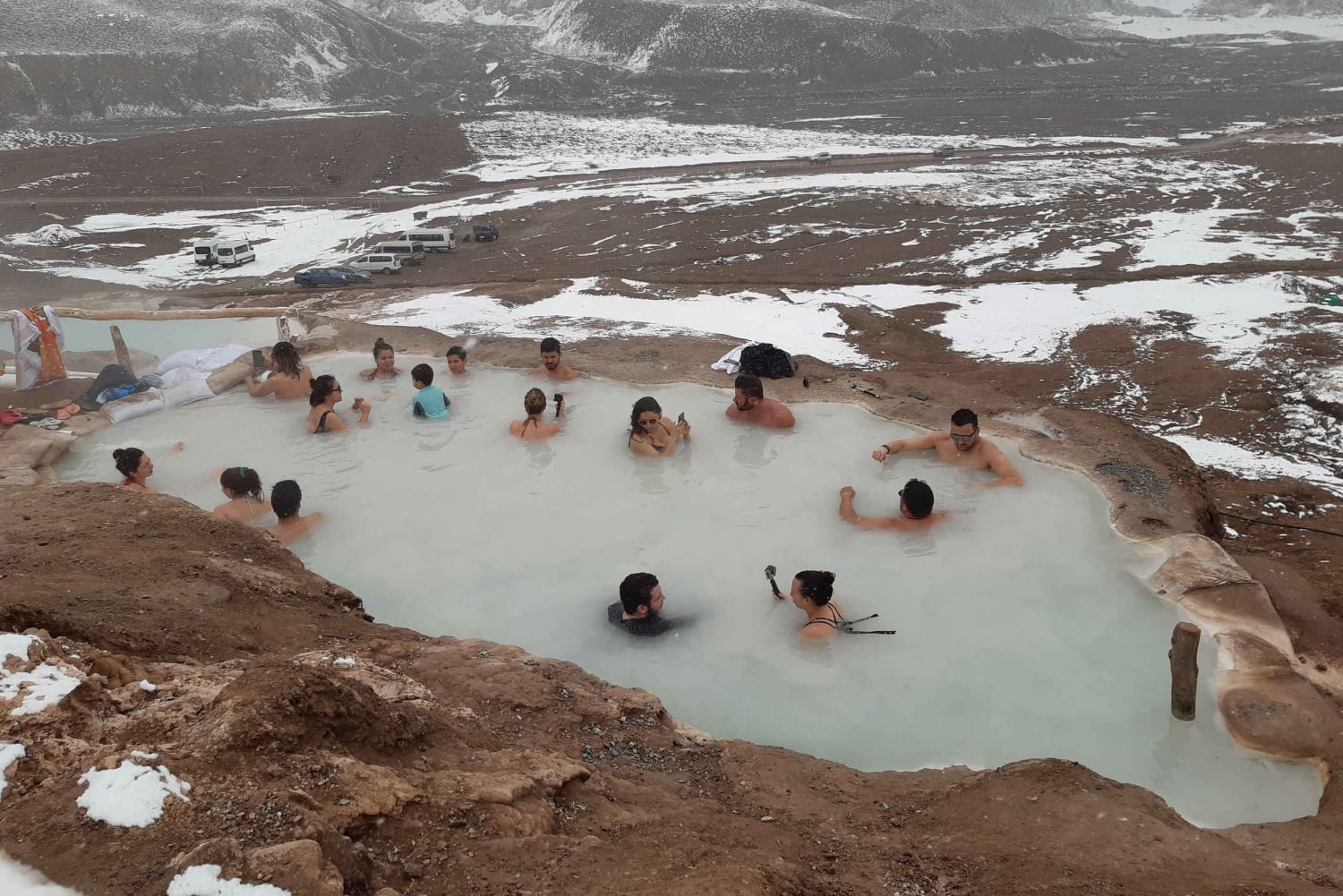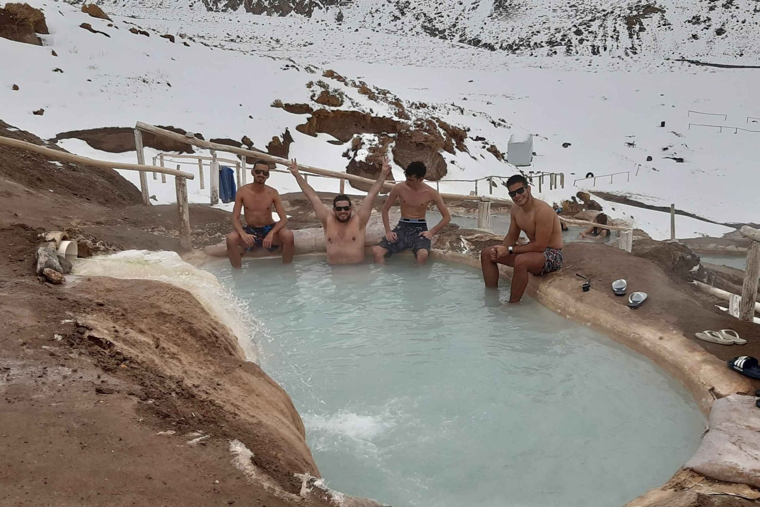 Wir brechen früh am Morgen auf, um den Sektor Cajón del Maipo zu besuchen, wo wir zu den Colina-Thermalbädern fahren, die 109 km vom Zentrum Santiagos entfernt im Herzen der Anden an den Hängen des Colina-Flusses liegen, der nur wenige Meter von den Bädern entfernt verläuft. Hier gibt es 9 Freiluftbecken mit Temperaturen zwischen 25 Grad Celsius in den untersten und 55 Grad Celsius in den obersten Becken, deren hochmineralisiertes Wasser magmatischen Ursprungs ist und aus dem Vulkan San José stammt.