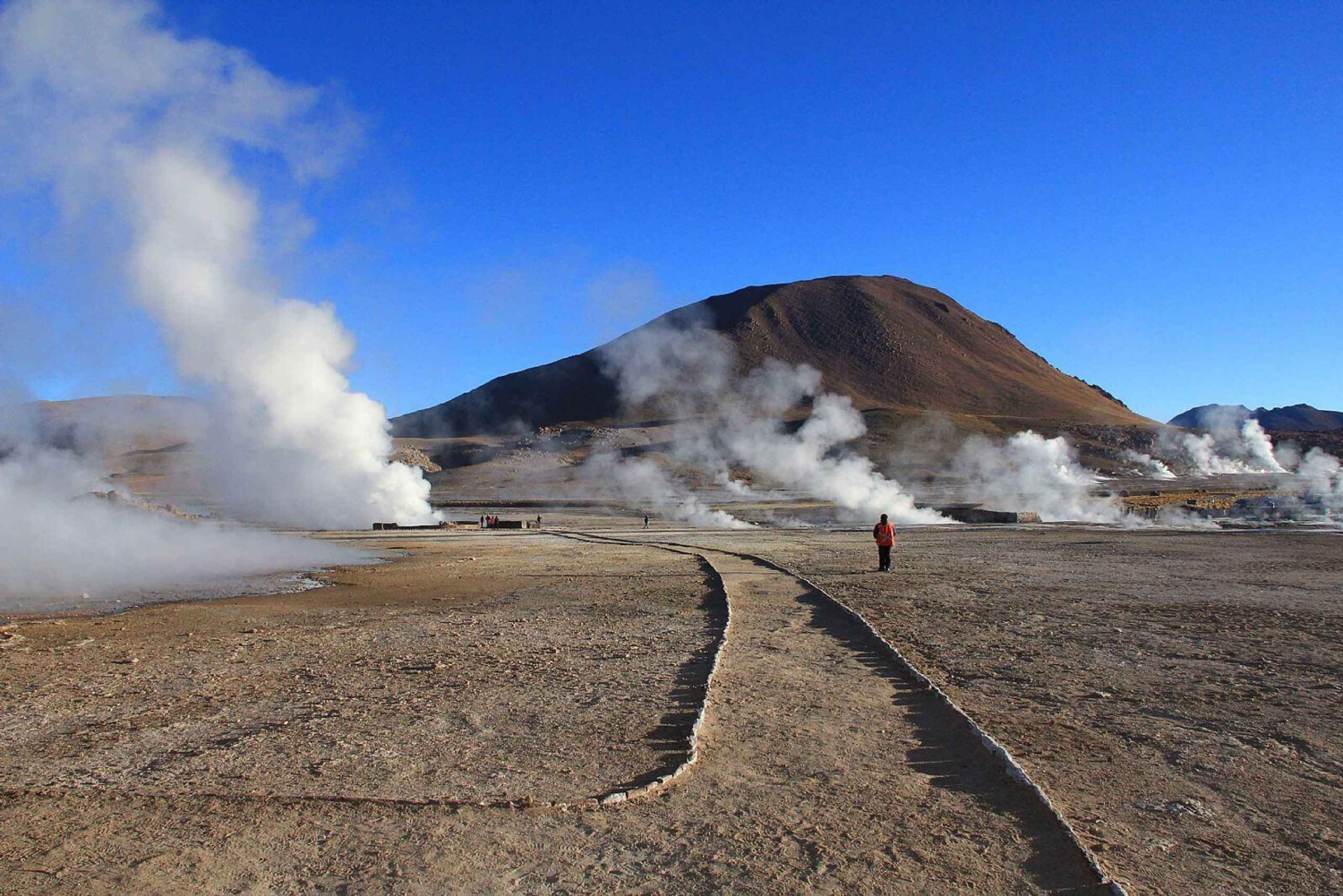 Empieza el día recogiéndote temprano en tu hotel de San Pedro de Atacama. Viaja a los Géiseres del Tatio, situados a 4.320 metros de altitud. Llega a los géiseres al amanecer y contempla un espectáculo geotérmico junto a la cordillera de los Andes.