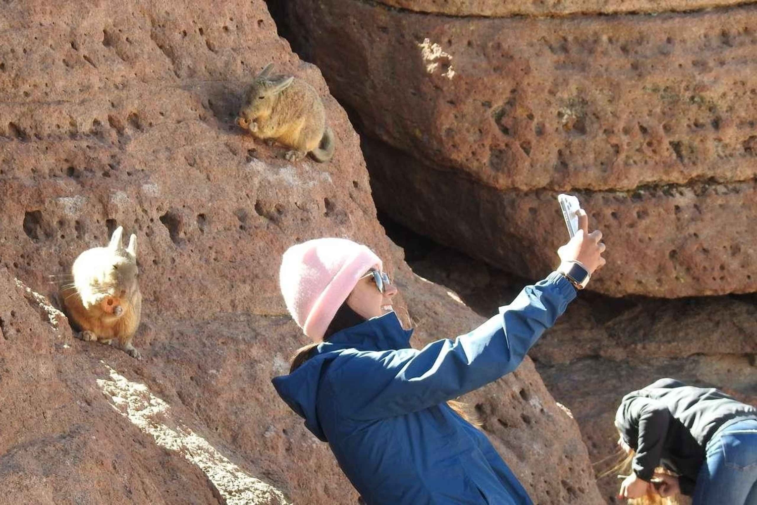 Start early around 5:00 AM to visit the Sol de Mañana Geyser (5,000 m) and walk alongside fumaroles and steaming craters filled with boiling mud pots at 150-200 °C. Afterward, you will have the opportunity to take a bath in outdoor thermal waters at 35 °C.