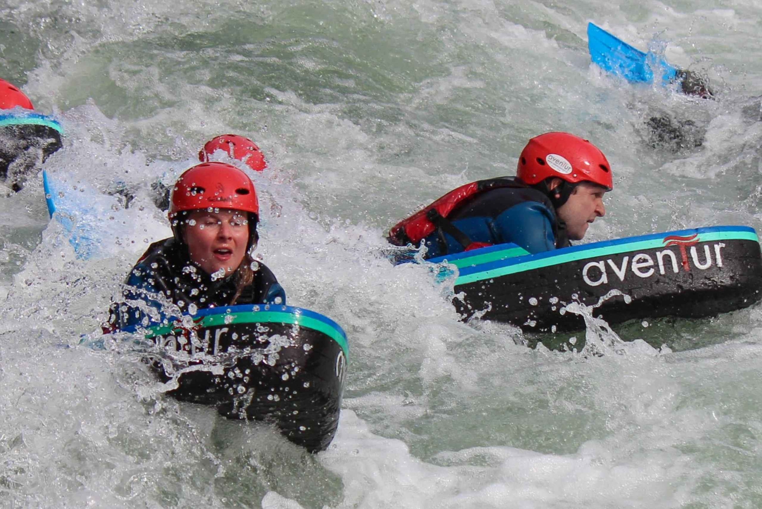 Polyuretaanilauta hydrospeed-harrastukseen, 5 mm neopreenipuku suojilla, 3 mm neopreenihousut suojilla, neopreenisukat, pelastusliivit, kypärät, potkurit ja käsineet kylmimmälle ajalle.