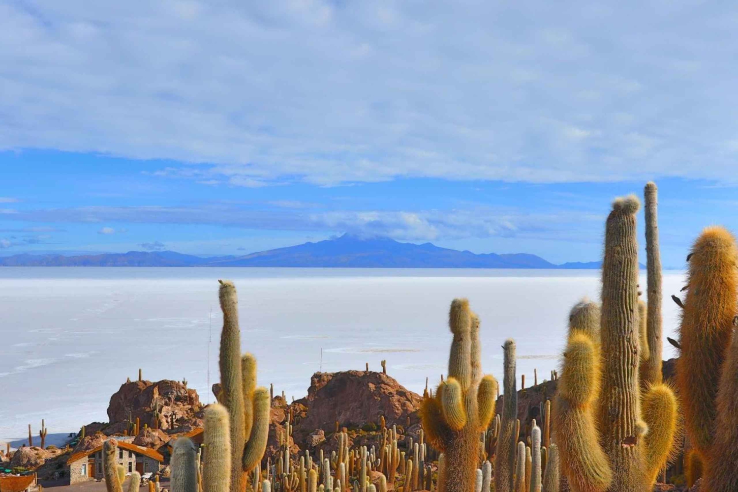 Aikaisin aamulla otamme ajoneuvomme ja siirrymme suolatasangolle. Näemme auringonnousun suolakertymän muodostaman valkoisen peitteen yllä, ja sitten siirrymme Incahuasin saarelle. Täällä voimme tehdä lyhyen kävelyretken tämän kalkkikivimuodostelman läpi, jossa on jättiläiskaktuksia ja josta meillä on hieno näkymä suola tasangolle. Sen jälkeen vierailemme suolamuseossa ja lähdemme suolatasangolta Colchanin kaupungin kautta, jossa pysähdymme ostamaan käsitöitä. Sitten ohitamme junan hautausmaan ja otamme valokuvia, ennen kuin saavumme Uyuniin, jossa päätämme retkemme.