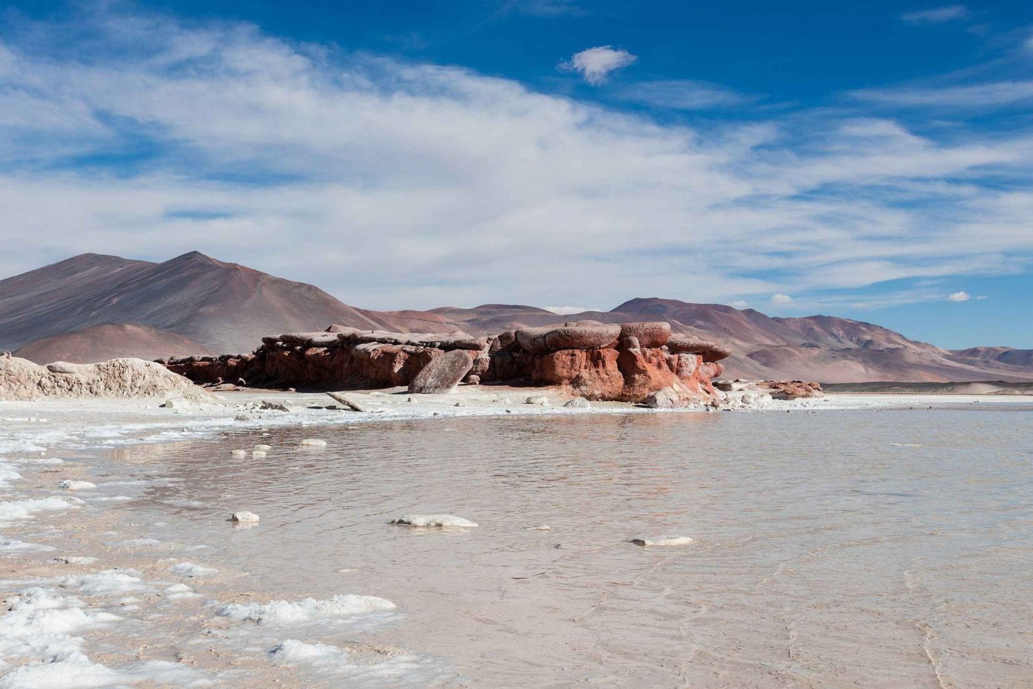 Observez la flore locale, qui se compose principalement de plantes en coussins et d'herbes. Continuez jusqu'au salar de Talar, connu sous le nom de 'pierres rouges', où les roches sont soumises à l'oxydation naturelle et aux intempéries, créant un paysage unique.