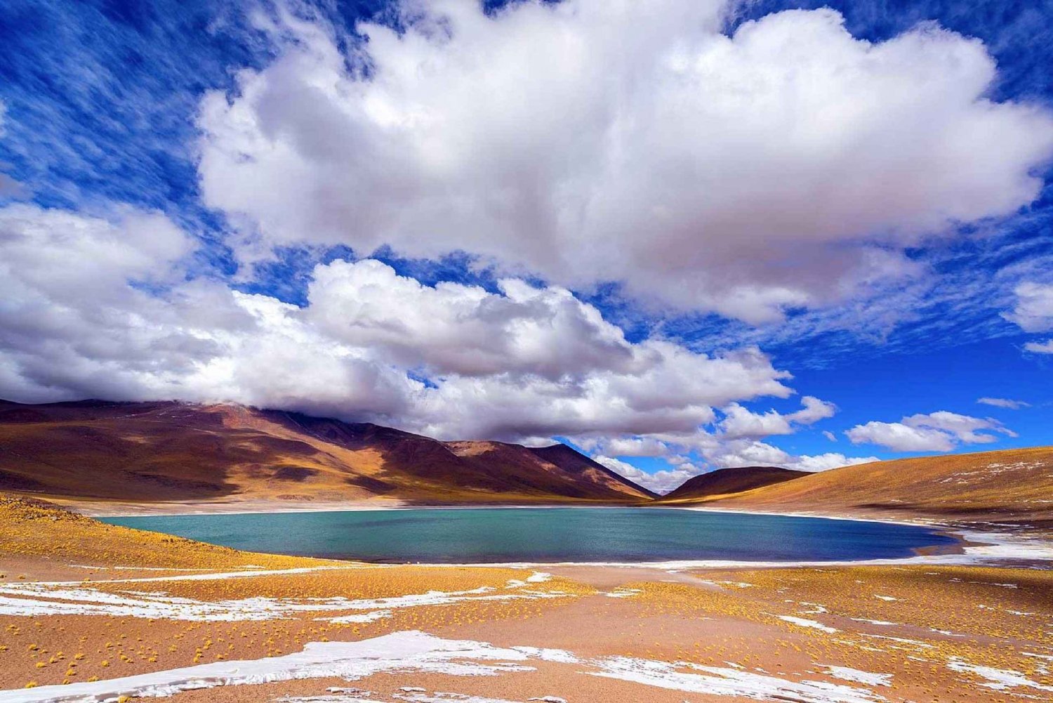 In seguito, ci recheremo al punto panoramico di Pacana, per visitare i monaci di Pacana, enormi pilastri di pietra che si ergono verticali e solitari nel mezzo del deserto. In seguito, visiteremo la piana di sale di Quisquiro, che si trova a più di 4.000 metri sul livello del mare. Qui avremo un po' di tempo per riposare e goderci i dintorni. Infine, passeremo per la salina di Aguas Calientes, caratterizzata da acque di diversi colori, sulla via del ritorno a San Pedro de Atacama.