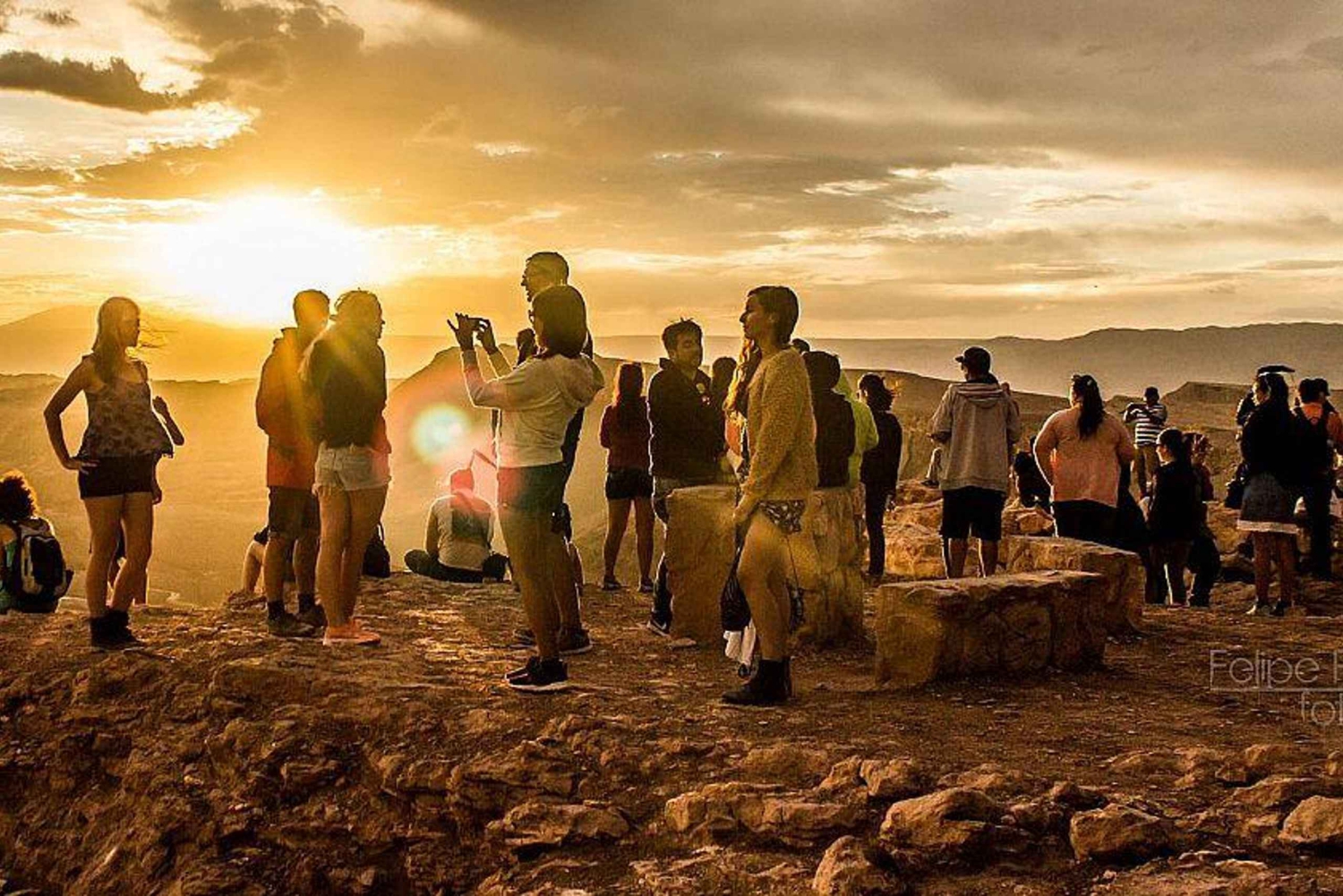 Daarna gaan we naar de Valle de la Muerte, waar een speciale tafel voor je wordt gedekt om uit te rusten, te genieten van een snack en te proosten op de reis. Tot slot beleef je het hoogtepunt van de tour: een verbluffende zonsondergang bij Piedra del Coyote. Leg de levendige kleuren van de woestijnhemel vast en maak blijvende herinneringen aan dit magische moment.