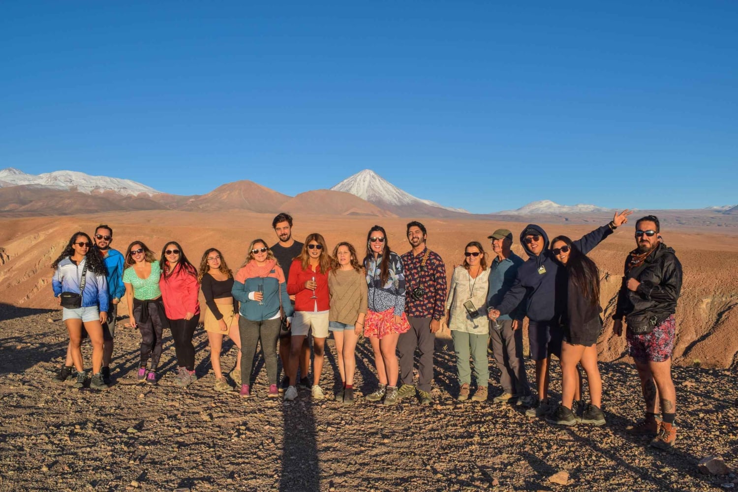 Når dagen går mot slutten, blir vi vitne til et enestående himmelspektakel fra et strategisk plassert utsiktspunkt. Vi nyter panoramautsikten som fanger Atacamaørkenens ville skjønnhet, mens himmelens glitrende farger utfolder seg i solnedgangen og gir oss et minneverdig øyeblikk i horisonten.