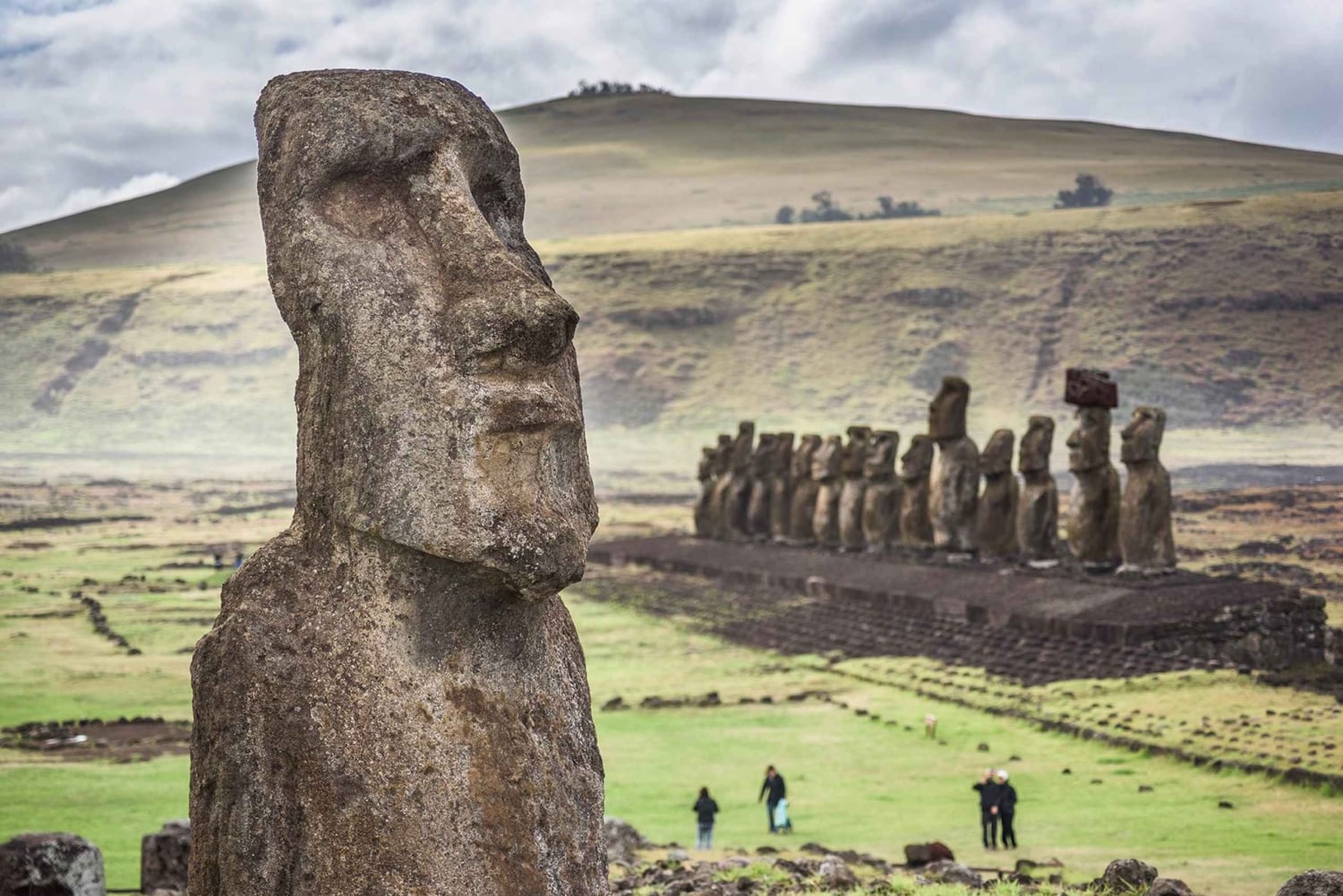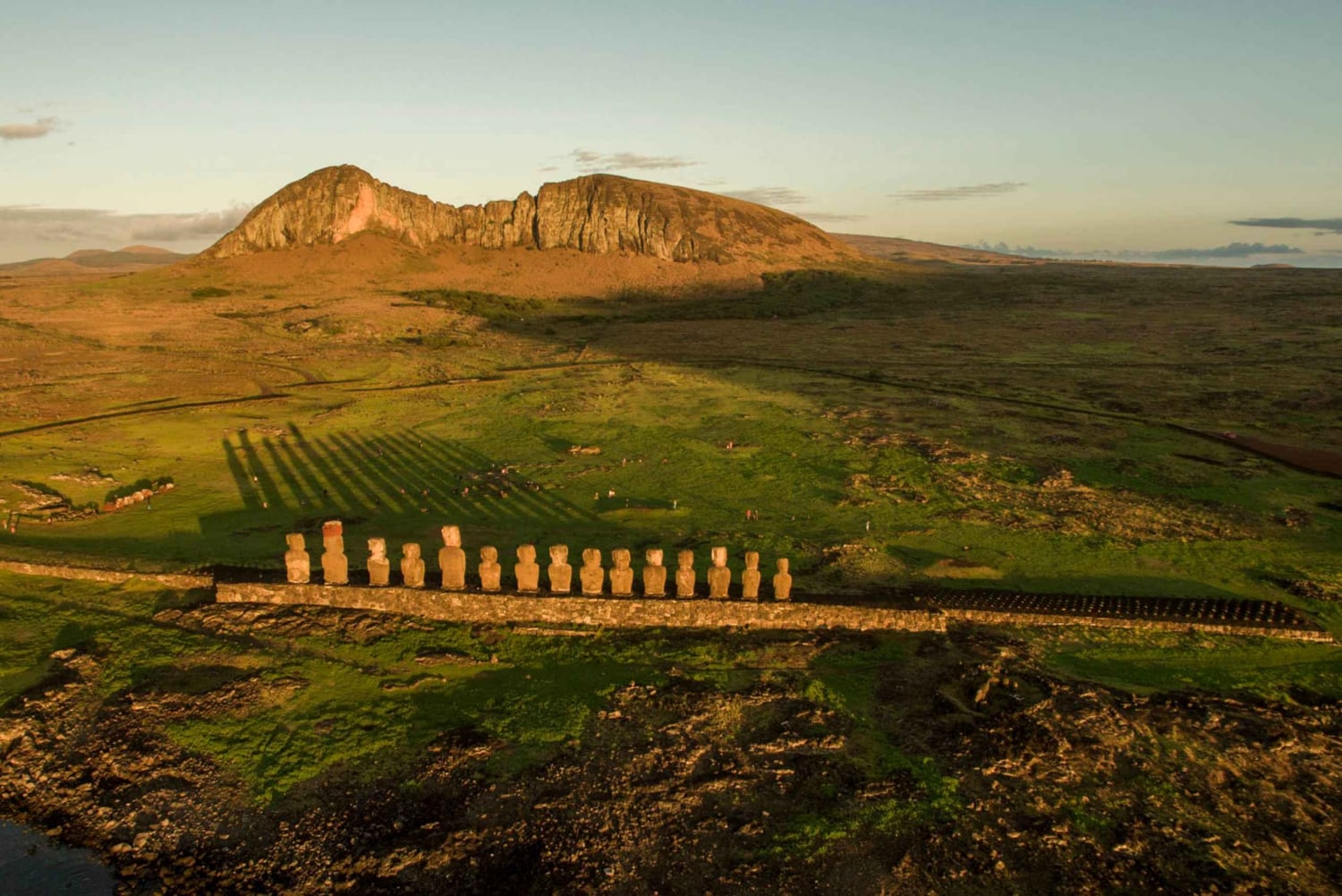 Następnie odkryj majestatyczny Rano Kau, zapierający dech w piersiach naturalny krajobraz i ważne starożytne źródło wody. Kontynuując, odwiedzimy Vinapu, archeologiczny klejnot prezentujący wyjątkowe rzemiosło Rapa Nui, z intrygującymi powiązaniami z inkaskimi stylami konstrukcyjnymi. Nasz dzień zakończymy w Tahai, odrestaurowanym kompleksie ceremonialnym nadzorowanym przez znanego amerykańskiego archeologa dr Williama Mulloya w 1974 roku. Tahai szczyci się trzema głównymi ahu: Ko Te Riku, Tahai i Vai Ure - idealne miejsce na wspaniałe zdjęcia zachodu słońca.