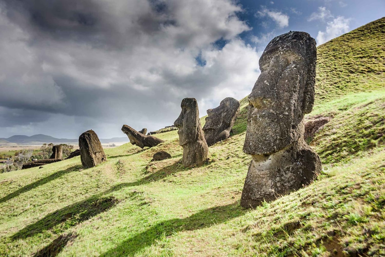 Ciesz się wygodą odbioru z hotelu w Hanga Roa. Rozpocznij swoją podróż w pobliżu wioski Akahanga, która była ważnym centrum ceremonialnym lub ahu. Zobacz kamienne głowy Wysp Wielkanocnych, znane jako moai. Dowiedz się o wojnach plemiennych, które miały miejsce na wyspie i moai, które zostały powalone podczas walk. Odwiedź pozostałości hare paenga, kamiennych domów w kształcie łodzi, które zostały zbudowane przez starożytnych mieszkańców wyspy. Kontynuuj do Ahu Tongariki, które jest największym ahu na wyspie i zawiera 15 moai. Zobacz Rano Raraku i kamieniołom, który jest źródłem skały wulkanicznej używanej do rzeźbienia moai. Podziwiaj 400 moai na różnych etapach rzeźbienia. Podążaj szlakiem do Ahu Te Pito Kura, gdzie znajduje się najwyższy posąg na wyspie, a także moai Paro. Podziwiaj kulisty kamień obok ahu. Mówi się, że ten masywny kamień jest pępkiem świata (Te Pito lub Te Henua), który według legendy został przywieziony na wyspę na łodzi Hotu Matua. Udaj się na białą piaszczystą plażę Anakena, gdzie Ariki Hotu Motua i jego siostra Avareipua przybyli na wyspę. Odwiedź Ahu Nau Nau, stanowisko archeologiczne starożytnej złożonej konstrukcji. W tym miejscu znajduje się 5 Moai z pukao, które mają petroglify z tyłu posągów. Pod koniec wycieczki zostaniesz odwieziony z powrotem do hotelu w Hanga Roa.