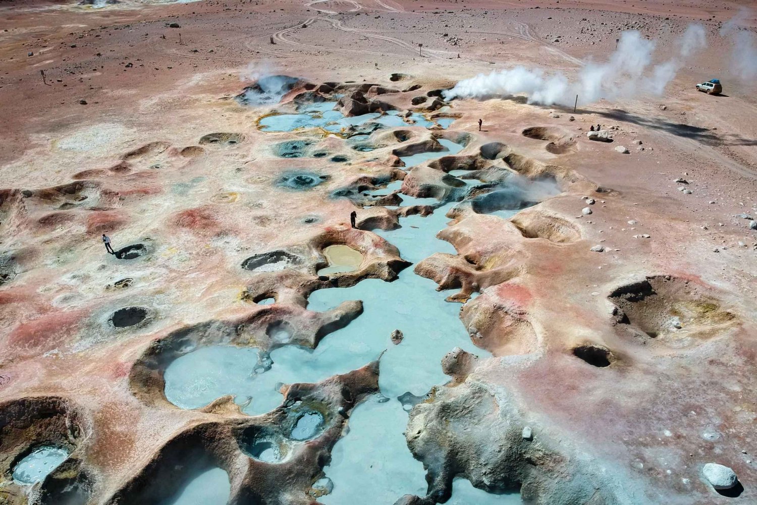 Наш четвертый и пятый дни перенесут нас в еще более отдаленные и впечатляющие пейзажи известного заповедника Эдуардо Авароа, где ждут Красная, Зеленая, Белая и другие лагуны с их розовыми фламинго и другими дикими животными. Безопасно приближайтесь к гейзерному полю Соль-де-Маньяна и воспользуйтесь еще одной возможностью искупаться в природных горячих источниках.