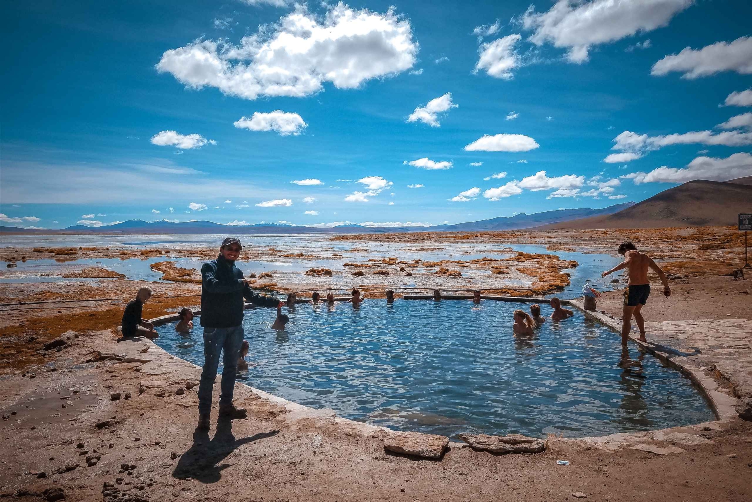 Mycket tidigt på morgonen, efter frukost, åker du till gejsrarna 'Sol de Mañana' och njuter av en fantastisk utsikt längs vägen; denna plats har vulkanisk aktivitet som fumaroler och gejsrar (hål med bubblande lera, rökning och en lukt av svavel).